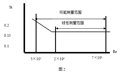 由此可見,通過測(cè)量卡門渦街分離頻率便可算出瞬時(shí)流量。其中,斯特羅哈爾數(shù)(St)是無因次未知數(shù),圖2表示斯特羅哈爾數(shù)(St)與雷諾數(shù)(Re)的關(guān)系。