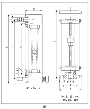 SK-LZB/LZB-( )F流量計的錐管為光滑內壁管(見圖4),通徑DN15以上的流量計,浮子通過導桿 上下移動,保持穩定;SK-LZJ/LZJ-( )F流量計錐管 內壁有三條導向凸筋,使浮子保持穩定(見圖4)。通徑DN10以下的流量計采用軟管連接,配有 針形流量調節閥;通徑DN15以上流量計采用法蘭連接。