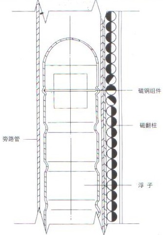 側(cè)裝式磁翻板液位計(jì)根據(jù)浮力原理和磁性耦合作用而成。當(dāng)被測容器中的液位升降時(shí),液位計(jì)主導(dǎo)管中的浮子也隨之升降,浮子內(nèi)的永久磁鋼通過磁耦合傳遞到現(xiàn)場指示器,驅(qū)動(dòng)紅、白翻柱翻轉(zhuǎn)180°。當(dāng)液位上升時(shí),翻柱由白色轉(zhuǎn)為紅色,當(dāng)液位下降時(shí),翻柱由紅色轉(zhuǎn)為白色,指示器的紅、白界位處為容器內(nèi)介質(zhì)液位的實(shí)際高度,從而實(shí)現(xiàn)液位的指示。