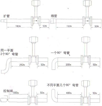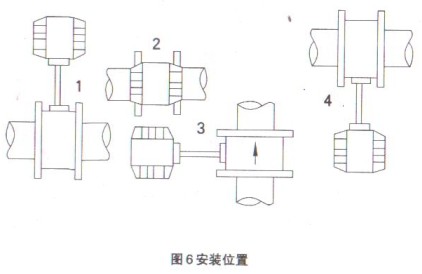 安裝條件:渦街流量計應(yīng)遠(yuǎn)離振動源,有振動時在前后直管段2DN處加支架用橡皮減振。傳感器通徑圓應(yīng)與直管段內(nèi)徑圓保持同心。法蘭焊接時,密封夾緊時,管內(nèi)不得有突出部分。流向應(yīng)與箭頭方向一致。(高溫時推薦2、3、4位置,常溫和低溫時推薦1位置,垂直管道時選3位置)見圖6