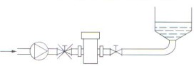 用聚四氟乙烯(PTFE)管材做的電磁流量計的傳感器襯里,它與傳感器測量管管壁一般不粘貼,因此,對真空負壓是敏感的。管道內真空會抽癟聚四氟乙烯襯里,使襯里呈波浪型拱起——典型的負壓破壞形態,這樣破壞了電極的密封,傳感器就不能工作了。因此,PTFE襯里的傳感器不能用于負壓系統,也應盡可能避免安裝在可能產生瞬間負壓的地方。如傳感器不應裝在泵的吸入端;閘閥應裝在傳感器的后側,如圖所示。