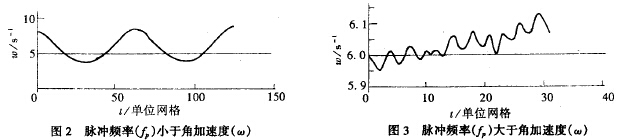 流量計(jì)產(chǎn)生誤差的主要因素是脈動(dòng)流的頻率,所加的正弦脈動(dòng)流的頻率與穩(wěn)態(tài)下渦輪的旋轉(zhuǎn)角加速度的關(guān)系為ω=2πfp(1/qm)r2時(shí),相應(yīng)曲線與輸入正弦曲線最為接近,與理論分析基本吻合,多次改變脈動(dòng)流頻率、振幅參數(shù),發(fā)現(xiàn)有時(shí)圖形失真非常厲害,通過(guò)對(duì)多幅圖形的比較,發(fā)現(xiàn)有如下規(guī)律:(見(jiàn)圖2、3)