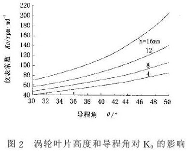 式2可見,對確定的渦輪流量傳感器)易知口徑D大, K0值小,葉片數(shù)n大, K0值大等.如果要獲得較大的儀表常數(shù),就要對渦輪傳感器的結(jié)構(gòu)參數(shù)進行優(yōu)化設(shè)計,從圖2(可以看出,葉片高度;增加, K0增大,導(dǎo)程角增大, K0增大.對于¢19的過環(huán)空大排量液體渦輪流量計而言,由上式計算得K0=74.567rpm/m3/d而水中標定的KW=78.89rpm/m3/d,表1給出不同口徑和不同導(dǎo)程角下液體渦輪流量計固有儀表常數(shù)的計算值.