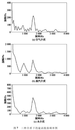 對圖 6 中靜壓數值進行快速傅立葉變換,得到如圖 7 所示的三種介質下的旋渦脫落頻率圖。