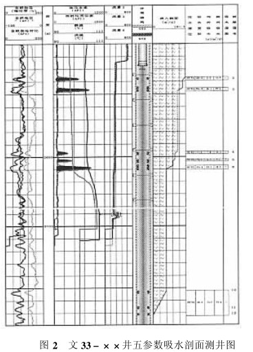 例如: 圖2是文 33-××井五參數吸水剖面測井圖,測井在2690m遇阻,第10、11、12" 號層未測出,但經電磁流量計測井曲線顯示,這3個遇阻層吸水,絕對吸水量為74.6m3/d,相對吸水量為41.2%。
