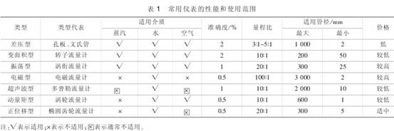 流量儀表的分類方法很多,至今國內外還沒有統一的標準。 工業生產過程中常用的七大類流量儀表的型式為:差壓型(孔板、文氏管),變面積型(轉子流量計),振蕩型(渦街流量計),電磁型(電磁流量計),超聲波型(多普勒流量計),動量矩型(渦輪流量計),正位移型(橢圓齒輪流量計)。表1簡要列出幾種儀表的性能和使用范圍。