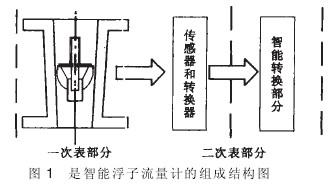 從目前的狀況看,玻璃管浮子流量計和塑料管浮子流量計已經基本成型,且應用比較成熟。而金屬管浮子流量計由于應用場合的結構的特殊性決定了它的市場很大,改進的空間也很廣。一般來說,金屬管浮子流量計大多由浮子錐管、傳感轉換器兩部分構成。也有少數包含智能信號處理器。其中浮子錐管、傳感轉換器屬于傳感部分,智能信號處理器是傳感部分的后續處理單元。傳感部分負責采集信號,獲取浮子高度、流量的相關信息;智能信號處理器是處理傳感部分采集的信息,進行流量顯示,置系數,和遠傳輸出。智能浮子流量計的結構見圖1.
