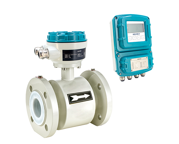 分體管道式電磁流量計由流量傳感器和轉換器兩大部分組成。測量管上下裝有勵磁線圈,通勵磁電流后產生的磁場穿過測量管,一對信號電極裝在測量管內壁與液體相接觸,產生感應電勢,將流量信號傳送到轉換器。