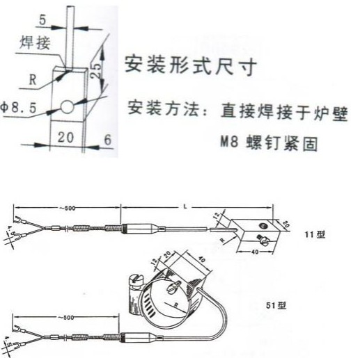 爐壁熱電偶是采用直徑Φ4或者Φ5的鎧裝熱電偶原件作為測溫探頭,測量端用螺釘、抱箍或者焊接(采用熱電阻原件時不宜采用焊接式)等方式將測溫探頭與導熱板表面緊緊貼合在一起,導熱板的另一面有與被測面相同的曲面,導熱板被焊在或者卡箍緊緊與被測爐壁相貼,即可測得爐壁或者管壁的溫度。爐壁熱電偶適用于電廠鍋爐爐壁、管壁及其他圓柱體表面測溫。