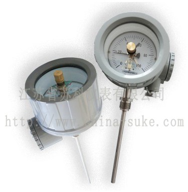防爆電接點雙金屬溫度計帶有電接觸裝置—即機械電接點。當被測介質溫度變化時,自由端上的細軸及轉向傳動機構帶動指針及動觸點轉動,在標度盤上指示出溫度的變化值,當其與定觸點(上、下限定觸點)接觸或斷開的瞬時,使電路系統中的繼電器及接觸器動作,以達到自動控制和報警的目的。 WSSX系列防爆電接點雙金屬溫度計是利用繞制成螺旋管狀的雙金屬片一端被固定,另一自由端與指針連接,隨著溫度的變化而轉動,并帶動指針旋轉指示溫度的單針式指示溫度計。是石油,焦化,化工,醫藥等企業生產現場存在碳化物等爆炸物各過程中的-80~+500℃范圍內液體、蒸汽和氣體介質以及固體表面的溫度測量。