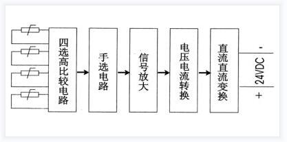 多路溫度遠(yuǎn)傳監(jiān)測(cè)儀是一臺(tái)最多支持四路輸入、自動(dòng)選擇最大一路的4-20mA二線制輸出的信號(hào)隔離轉(zhuǎn)換器,它可就近安裝在測(cè)量點(diǎn)附近 ,二線制輸出同時(shí)作為信號(hào)傳輸和儀表的供電電源線.4~20mA輸出電流分為兩個(gè)部分,恒定的4mA電流作為測(cè)量零點(diǎn),同時(shí)又是儀表電子線路的供電電流,而疊加在4mA上的0~16mA變化的電流是正比于被測(cè)量輸入信號(hào)的變化,例:0~150℃測(cè)量信號(hào)對(duì)應(yīng)于4~20mA的電流信號(hào)輸出.熱電阻/熱電偶傳感器的測(cè)量信號(hào)通過(guò)輸入電路(選擇高信號(hào))或選點(diǎn)輸入電路選中某一路信號(hào),該信號(hào)通過(guò)放大和電壓/電流(V/I)轉(zhuǎn)換單元將放大器的輸出電壓轉(zhuǎn)換為4~20mA恒定電流輸出,原理框圖如下圖所示: